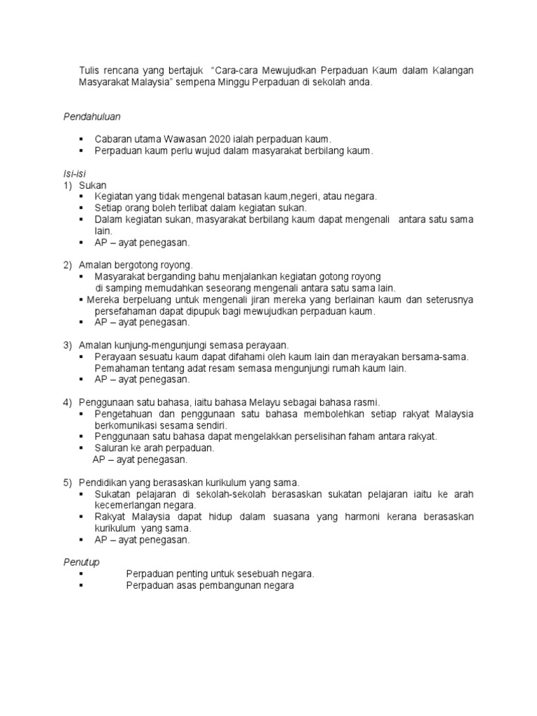 Contoh Karangan Sukan Ke Arah Perpaduan Pt3