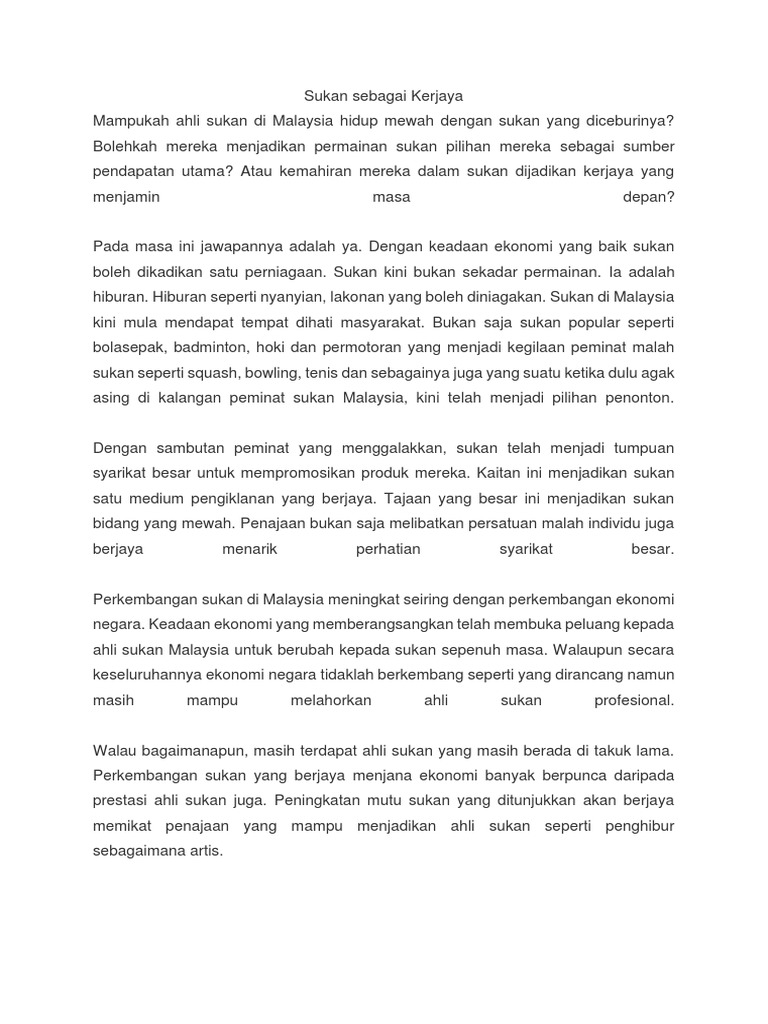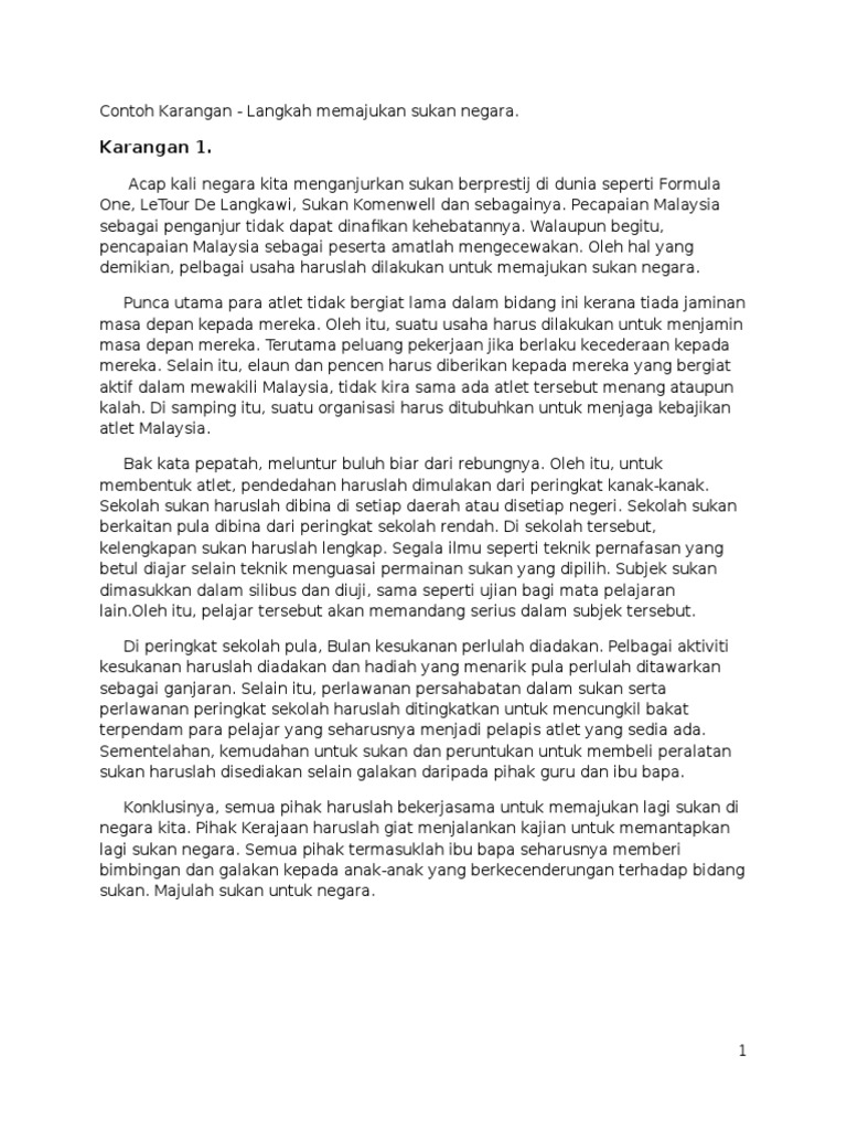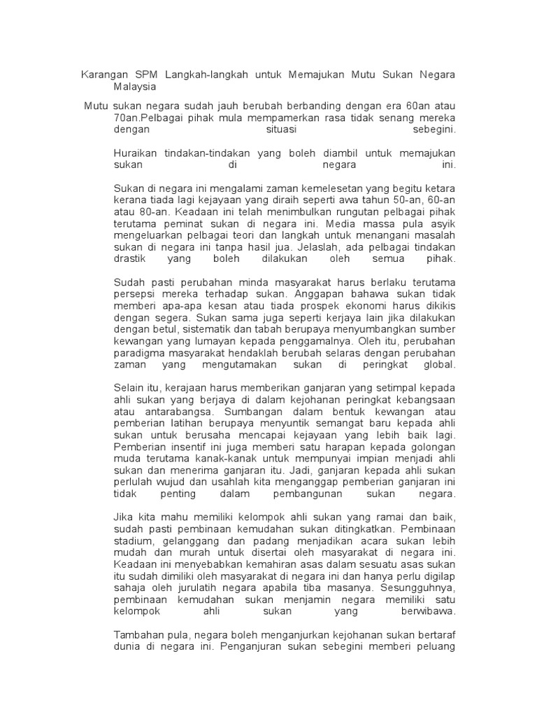 Save save contoh karangan berkaitan sukan for later. Lihat sahaja persatuan persatuan seperti persatuan bolasepak malaysia fam. Karangan spm langkah langkah untuk memajukan mutu sukan negara malaysia mutu sukan negara sudah jauh berubah berbanding dengan era 60an atau 70an pelbagai pihak mula mempamerkan rasa tidak senang mereka dengan situasi sebegini.