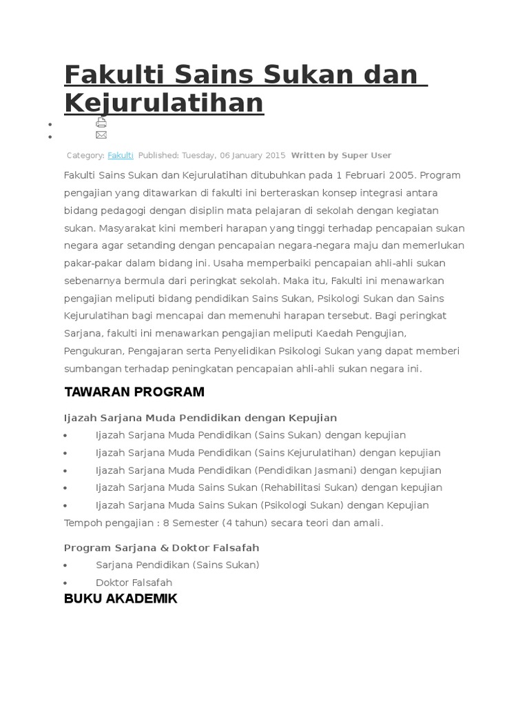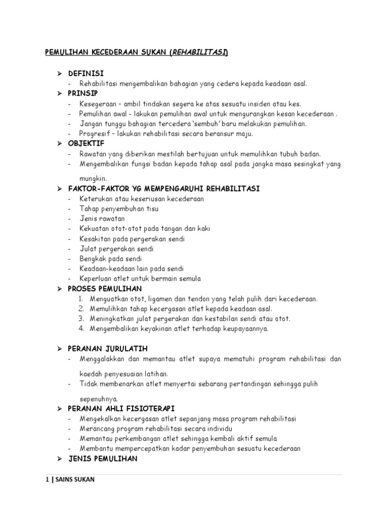 Kecederaan sukan dan rehabilitasi sukan blog ini adalah untuk memberi pemahaman tentang kecederaan dalam sukan dan rawatan pemulihan sukan kepada para pelajar dan masyarakat umum yang bergiat aktif dalam sukan. Sarjana muda sains sukan rehabilitasi sukan dengan kepujian mqa fa4341. Pendidik psikologi sukan pendidik psikologi sukan tergolong dalam kalangan mereka yang mendapat latihan secara profesional dalam bidang pendidikan jasmani dan sains sukan.