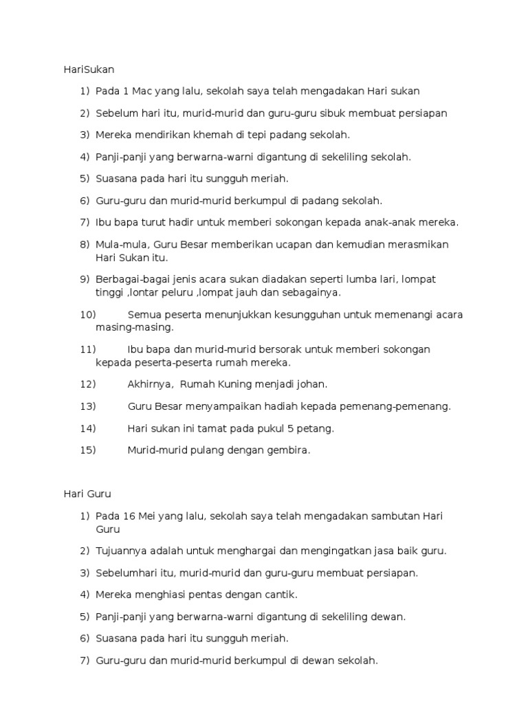 Temasya sukan sekolah saya pada hari ahad yang lepas sekolah saya telah mengadakan temasya sukan tahunan sukan tahunan tersebut diadakan di padang sekolah saya yang luas itu. Contoh karangan upsr ppsr.