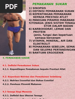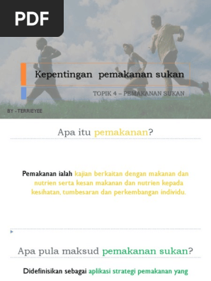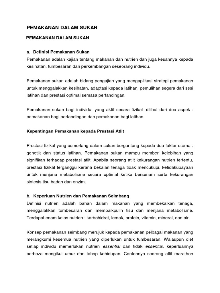 Diet bermaksud pengambilan makanan oleh seseorang individu. Pemakanan sukan pemakanan sebelum pertandingan dimakan 3 4 jam sebelum pertandingan pemakanan adalah utk menyimpan glikogen dan mengekalkan tahap cecair yang tinggi makanan sebelum pertandingan seperti a. Kepentingan pemakanan terhadap prestasi atlet prestasi optimum dalam sukan dipengaruhi bawaan genetik dan latihan yang sesuai.